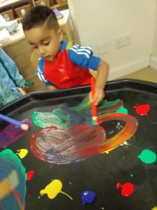 The toddler room children have been exploring with paint! They enjoyed mixing the colours together, exploring the texture and making wonderful patterns.