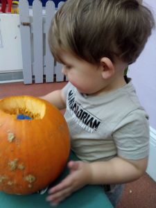 The children, who liked the feel of the pumpkin, enjoyed playing and exploring all parts of the pumpkin.