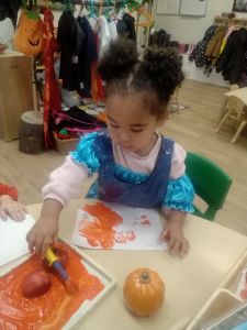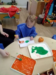 After reading a pumpkin story they explored using orange and green paints to create their own pumpkin pictures.
