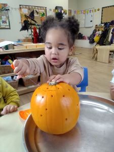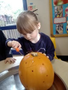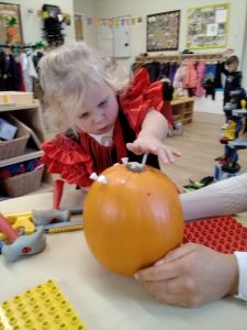 The team then provided the children real pumpkins to explore. Developing their language the toddlers used lots of words to describe the pumpkins as “orange”, “big”, “soft”, “heavy”.