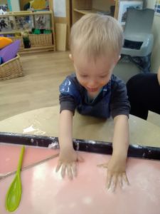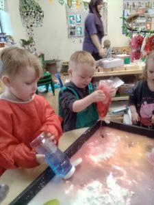 They were ‘making soup’ whilst playing with the corn flour by using language such as ‘we are making orange soup’! They used utensils to stir the mixture and transport in into bowls.