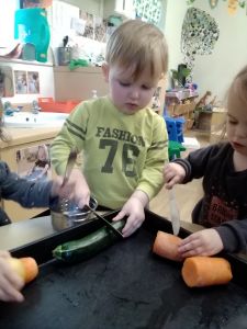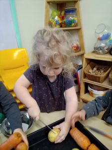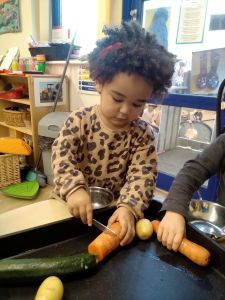 The practitioners wanted to extend this interest to real life experiences by enabling the children to make their own soup, using vegetables. The children, under supervision, cut the vegetables into pieces and sorted them into pans.
