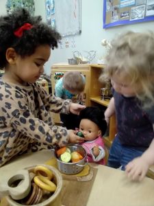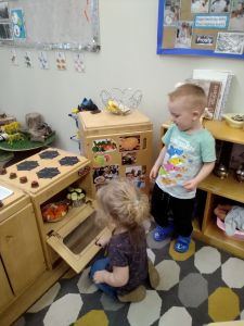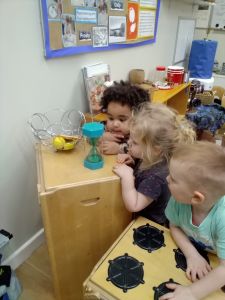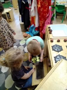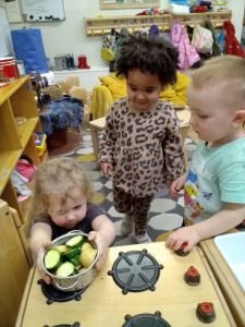 The children extended the activity by transporting their cut up vegetables to the oven in the home corner using language that demonstrated that they understood time by using language such as ‘mine will take five minutes to cook’. They then decided to feed the babies, re-visiting real life experiences from home.